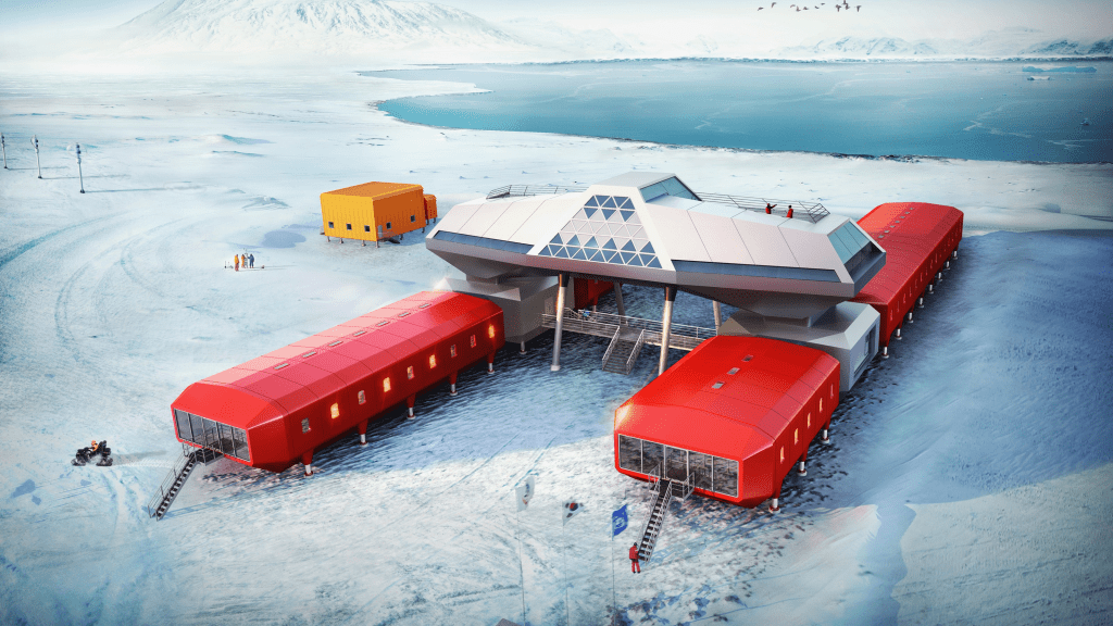 Located 10,000 miles from the UK on a floating ice shelf, the new station is designed to be self-sufficient, able to withstand freezing winter temperatures of minus 55ºC, have minimal impact on Antarctica’s pristine environment, and be an aesthetically stimulating place to live and work.