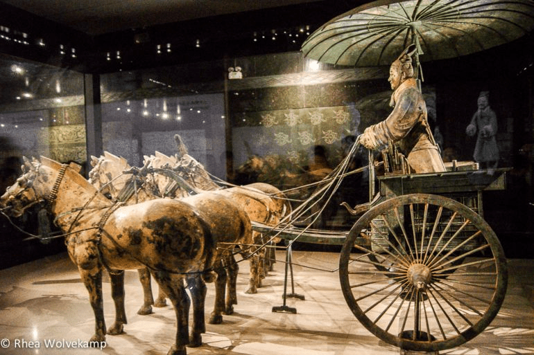 Besides infantry, the army includes 600 horses and almost 100 chariots which carry officers and riders and have either a two, three, or four-horse team. The soldiers were set in regular rows and are depicted in different postures – most are standing while some are crouching.