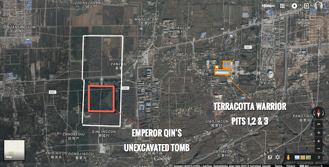 The mausoleum of Shi Huangdi, actually an entire multi-burial complex which covers an incredible 35 to 60 square kilometers, was discovered in 1974 CE buried at the foot of the artificial Mt. Li near Lishan (modern Lintong), 50 km east of the Qin capital Xianyang in Shaanxi Province, central China.