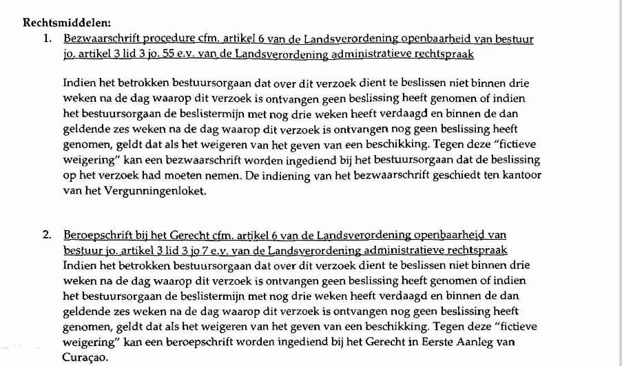 Beslist de overheid niet op tijd (uiterlijk binnen 6 weken)? Of wordt uw verzoek afgewezen? Dan kunt op basis van de Landsverordening Administratieve Rechtspraak (LAR) beroep aantekenen.